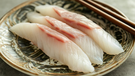 Beautifully arranged fresh raw flatfish slices on a decorative plate, perfect for a gourmet seafood dish. Ideal for culinary presentations and food styling.
