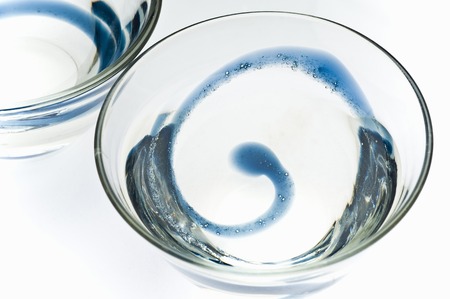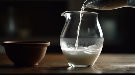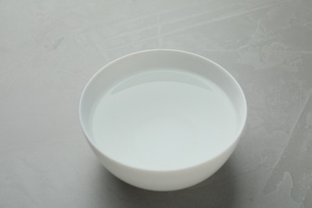 Close-up shot of micellar toner in a glass bowl on a table showing subtle ripples and organic wave patterns on the liquid surface with a calming and serene ambiance