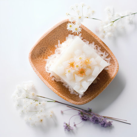 Water chestnuts in coconut milk served in a clear bowl, styled on white background