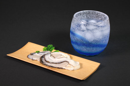 Shochu and snacks placed on a black wood grain background. The moment of pouring from the bottle.