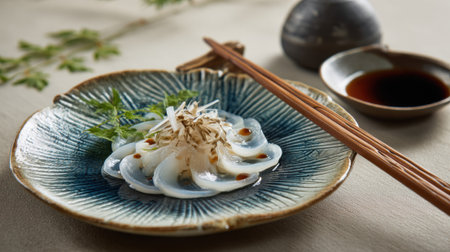 Fresh squid sashimi elegantly served on a traditional Japanese plate.