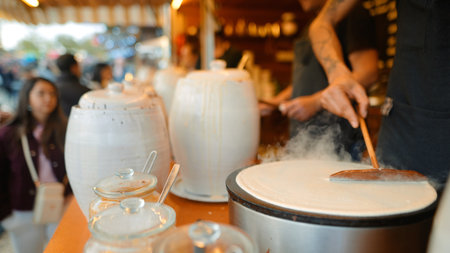 Steam rises from a metal tray filled with a hot cooking liquid, creating a unique foamy texture. Perfect for culinary and kitchen-themed projects.