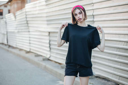 Sexy woman or girl wearing black blank t-shirt with space for your logo, mock up or design in casual urban style