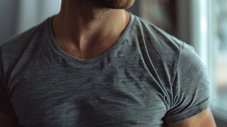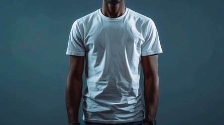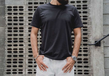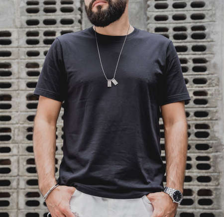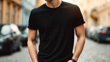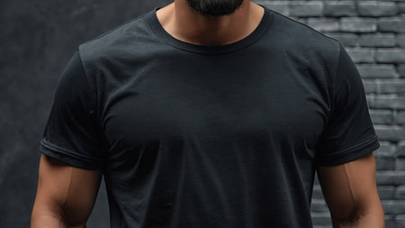 Cropped image of a man wearing a plain black t-shirt, suitable for apparel mockups