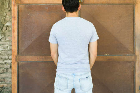 Rear view of a young man showing the trendy print in the back of his gray t-shirt