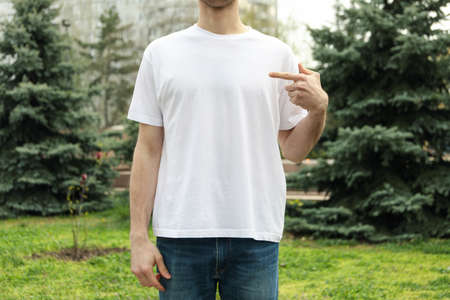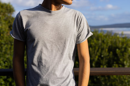 Mid section of caucasian man wearing grey short sleeved t shirt in nature with copy space. Fashion, trends, clothes concept, unaltered.