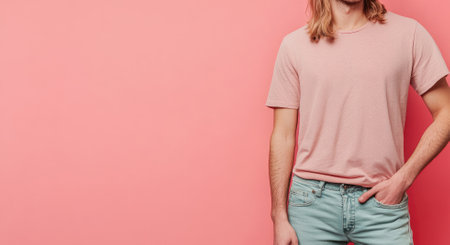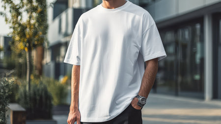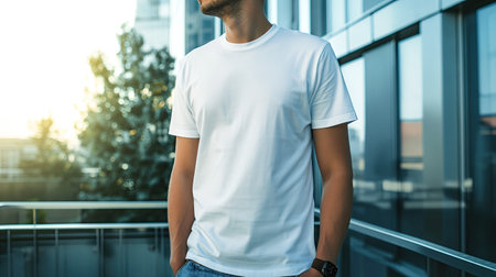 Minimalist fashion concept with male model in white t-shirt mockup, centered in bright, empty indoor space