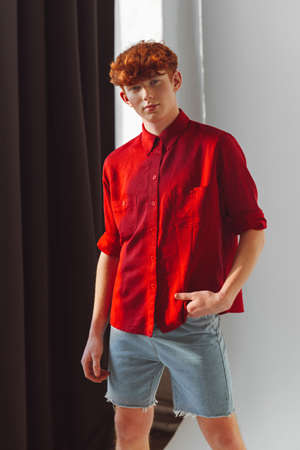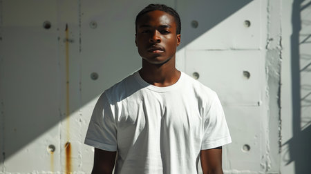 Young Man Wearing White T-Shirt Stands In Front of White Wall With Shadows
