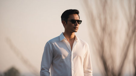 AI Generated. Man in white shirt and sunglasses outdoors in soft natural light