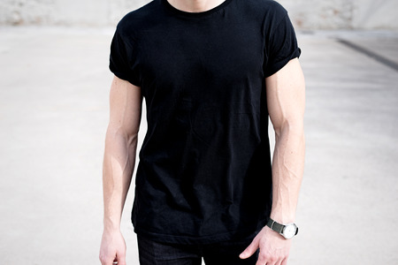 Closeup view of young muscular man wearing black tshirt and jeans posing outside. Empty background. Hotizontal mockup.