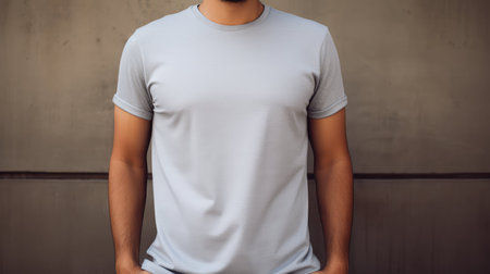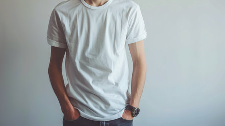 Cropped shot of a person wearing a blank white t-shirt, ideal for mockup designs, against a light grey background. Generative AI