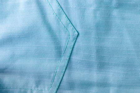 Soft blue, turquoise cotton fabric texture background with stitched diagonal stripes and with pocket