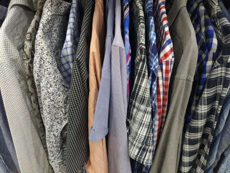 Clothes hung on hangers. Assortment of second hand store. Men's shirts hanging on a rack, ready for sale to customers. Saving money in crisis. Cheap shopping. Checkered, striped, plain men's shirts.
