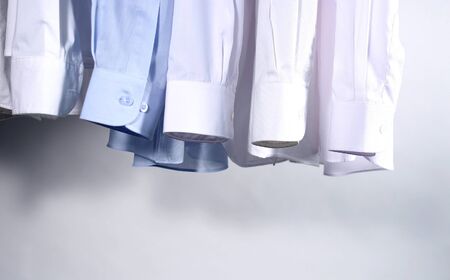 Men's shirts hanging on a hanger in the closet