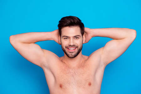 Young handsome naked man keeps his hands behind the head after taking a shower isolated on blue background