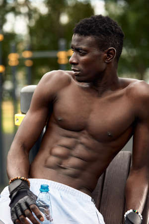 Fit strong shirtless young African black man standing at urban wall.