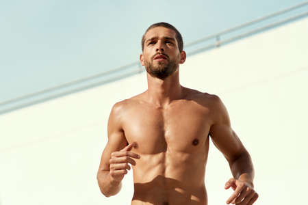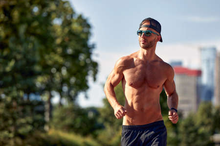 Urban sports. Sporty man shirtless jogging for fitness in the city park on a beautiful summer day