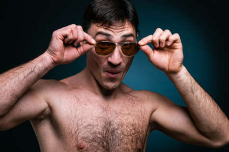 Crazy stylish male with tattooed naked body in sunglasses takes a selfie photo in a studio against the white wall