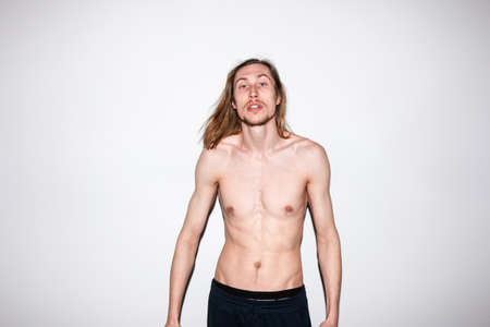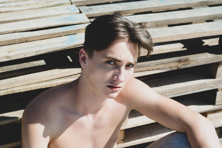 Topless man portrait. Naked photoshoot. Modern fashion youth, aggressive young male