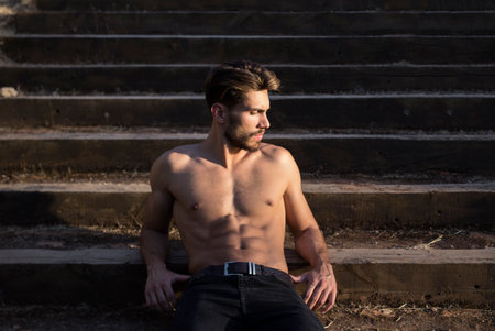 Full body of serious young muscular male with naked torso in stylish ripped jeans touching head and looking away while sitting on stairway at sunset in park