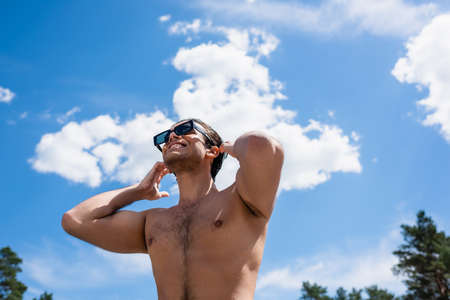 low angle view of young shirtless man against blue sky outdoors