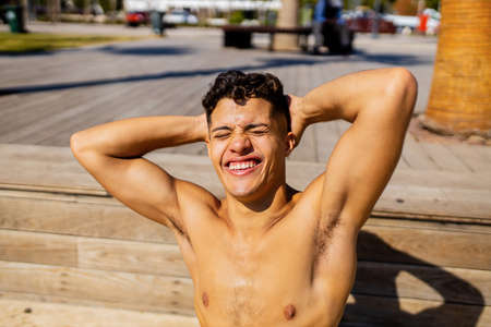 Young male adult with his arms out enjoying the sunshine shirtless on a warm summer's day