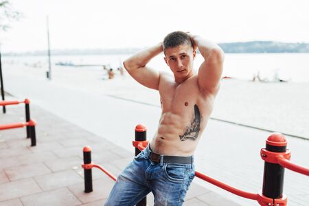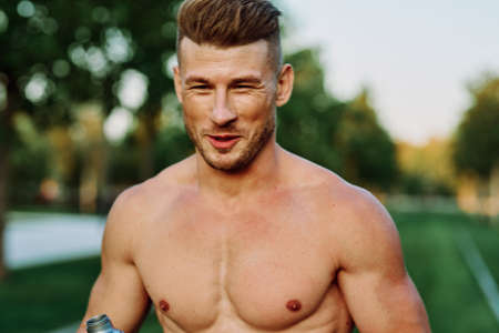 athletic man with pumped up muscular body in the park exercise workout motivation