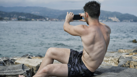 Young handsome man at the seaside using smartphone to take shots and film footage of the sea or ocean