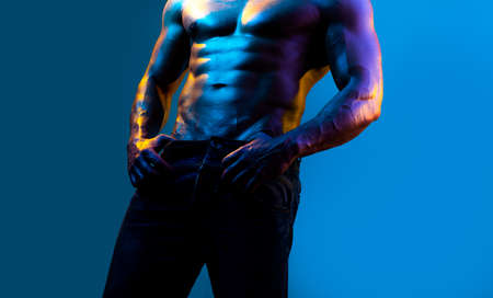 Studio portrait of a brutal young man in jeans and with naked torso standing by the white wall in pink and green lighting. Men's beauty and health. Copy space.