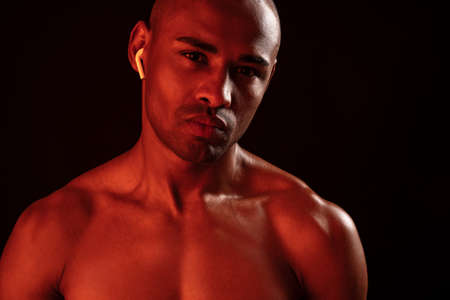 Cropped view of handsome young black sportsman with naked torso posing in neon light