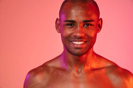 Image of a happy cheerful african fitness man posing isolated over neon wall background