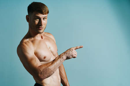 cute athlete showing thumb on blue background naked torso muscles biceps triceps model