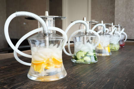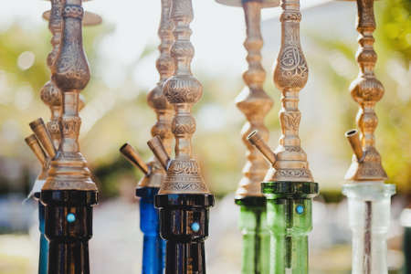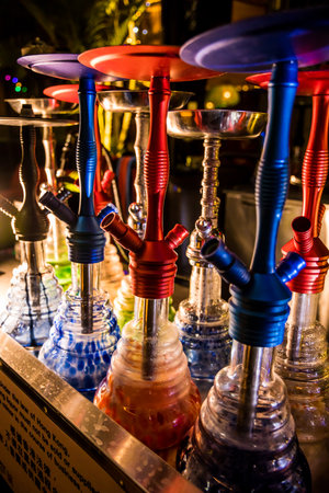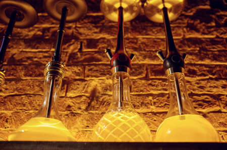 Several hookahs stand in a row. Concept - a shop selling hookah. Finished hooka at the bar. Concept - Courses for the preparation of the chillum. Calabash in a night club. Party with a hookah.