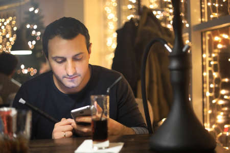 man smoking pipe of hookah in night cafe