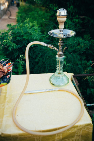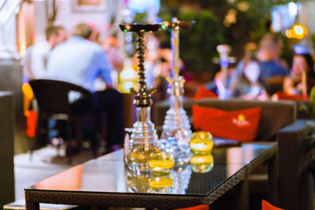 bar for smoking a hookah. The background is blurred. In the foreground is a big hookah