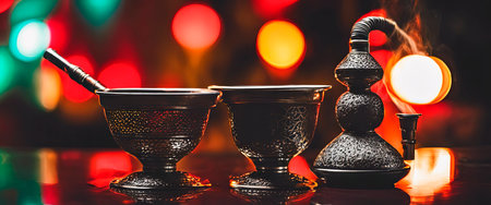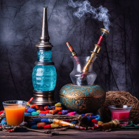 hookah close-up with smoke on a background.Hookah with a glass flask and a metal bowl shisha no smoke.Bowl of hookah with kaloud lotus, saucer and tongs, smoke around.a bowl of hookah coals in the smoke.created with the help of artificial intelligence.