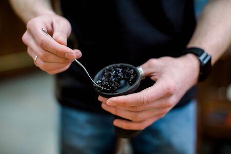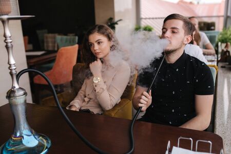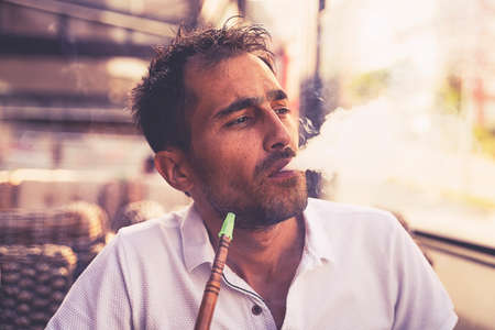 Close-up shot of a stylish adult guy smoking hookah indoor of a cafe