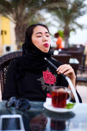 Muslim woman smoking hookah in a coffee bar