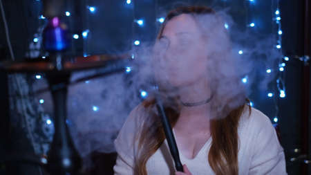 girl let the smoke from a hookah in blue light