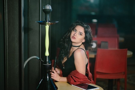 Sexy brunette girl in seductive black clothes smokes a hookah while sitting on counter in a nightclub or bar.