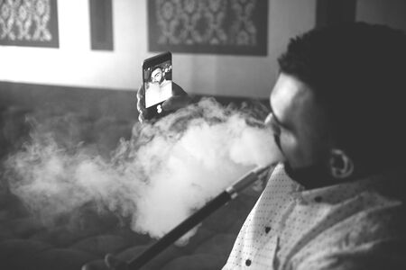 Young Man Smoking Shisha At Arabic Restaurant - Man Exhaling Smoke Inhaling From A Hookah and Taking Selfie With Phone
