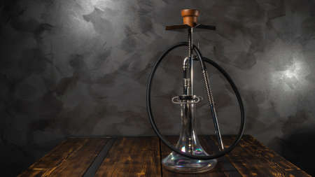 Modern hookah with glass bowl on wooden table. Gray wall background.