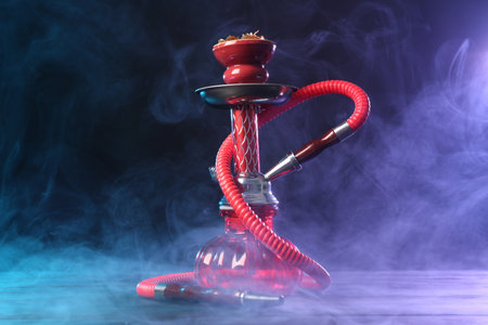 Hookah on wooden table with smoke in color lights against black background