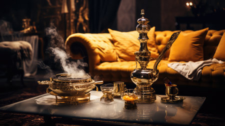 Gold hookah on table in lounge cafe. Shisha with burning coals at top. Thick fume in flask of smoking apparatus. Leisure in oriental bar.