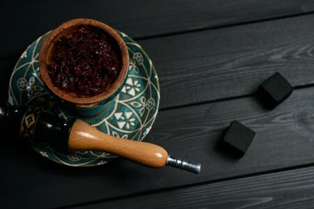 hookah shisha with coals on the table on a black background