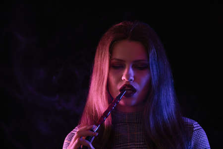 Young woman smoking hookah on dark background