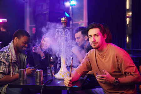 Close-up shot of a stylish adult guy smoking hookah indoor of a cafe, sitting at the table together with his friends.