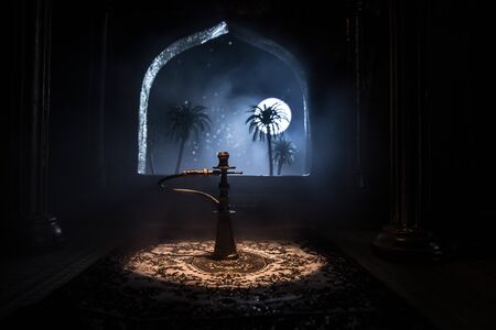 Hookah hot coals on shisha bowl making clouds of steam at Arabian interior. Oriental ornament on the carpet. Stylish oriental shisha in dark with backlight. For Shisha advertisement. Selective focus