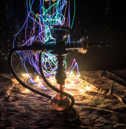 Modern hookah, shisha on a smoky black background with colored lighting and smoke. Close-up and place for your text