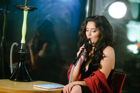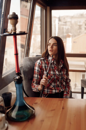 A cute brunette with long hair in a plaid shirt smokes a hookah while sitting at a table in a cafe. The concept of a pleasant pastime and female beauty. Young caucasian woman smokes a hookah